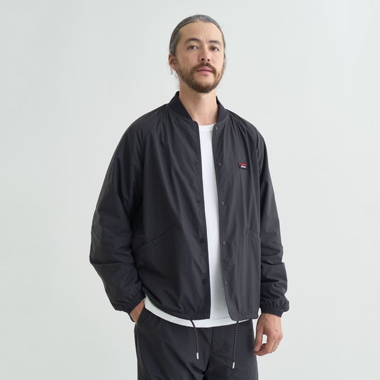 端境期に活躍してくれる、薄手で暖かいコーチジャケット。ラグランスリーブや襟元のリブ、袖口のシャーリングなどフィット感を高めたスポーティーな味付けになっている一 方で、表地に鈍い光沢感のあるナイロン生地、裏地には起毛トリコットを用いて落ち着い た雰囲気にまとめました。