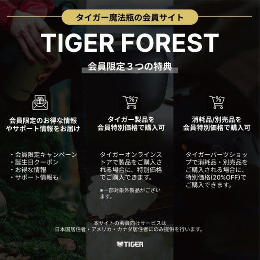 ■タイガー魔法瓶の会員サイト 「TIGER FOREST(タイガーフォレスト)」のご紹介 製品サポート情報の一括管理や、会員様限定のキャンペーン情報のお知らせなどお客様の満足度向上を目指したタイガー魔法瓶の会員サイトです。消耗品・別売品を会員特別価格でご購入できます。ぜひこの機会に会員・製品登録をお待ちしております。