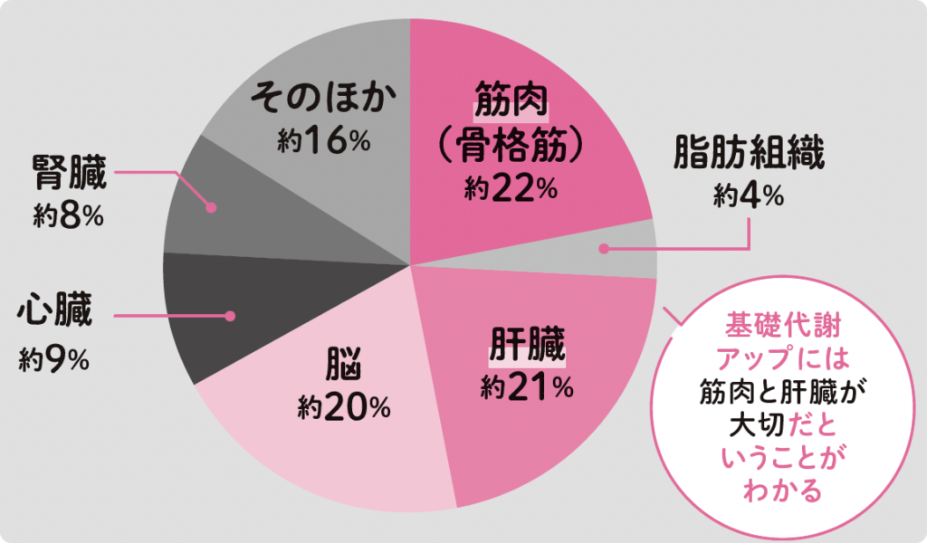 これら3つの中で最も多くのエネルギーを消費するのが「基礎代謝」です。その割合は、1日の消費エネルギーの約60%。したがって、脂肪を効率よく燃やすには、この基礎代謝を上げることが不可欠になります。