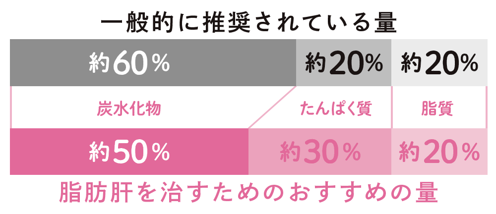 脂肪肝を改善し、体についた脂肪を落としたいなら、「たんぱく質3:炭水化物5:脂質2」というバランスが理想的です。1日のたんぱく質摂取量は体重キロにつき1グラムが目安ですが、女性や高齢者は1.2~1.5グラム程度を目標に意識的に多めにとるようにしてください。さらに、一回に吸収できるたんぱく質量は約20グラムなので、毎食ごとに20グラムぐらいをとるようにするといいでしょう。