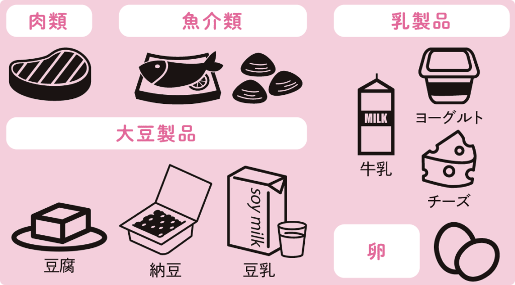 肉類/魚介類/乳製品(牛乳・ヨーグルト・チーズ)/大豆製品(豆腐・納豆・豆乳)/卵