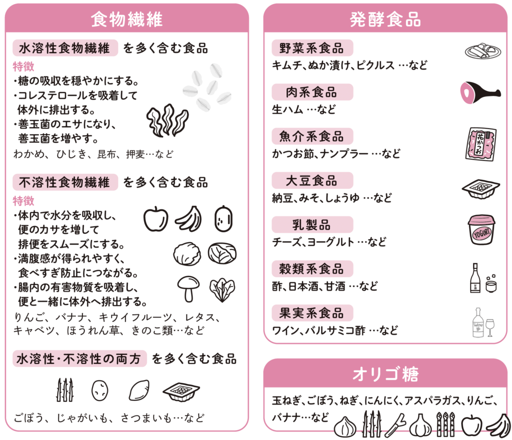 善玉菌のエサとなり、善玉菌を増やす働きをする。発酵食品とあわせてとるとよりパワーアップ。