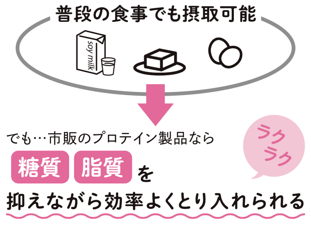 たんぱく質は肉類、魚介類、卵、大豆製品、乳製品などに多く含まれ、普段の食事で摂取できます。とはいえ、糖質や脂質の量を抑えながら、十分なたんぱく質を食事のみで摂取することは簡単ではありません。また、筋トレで筋肉を増やしたい場合は、通常よりも多めにたんぱく質をとる必要があります。そこで、おすすめなのが「プロテイン」です。
