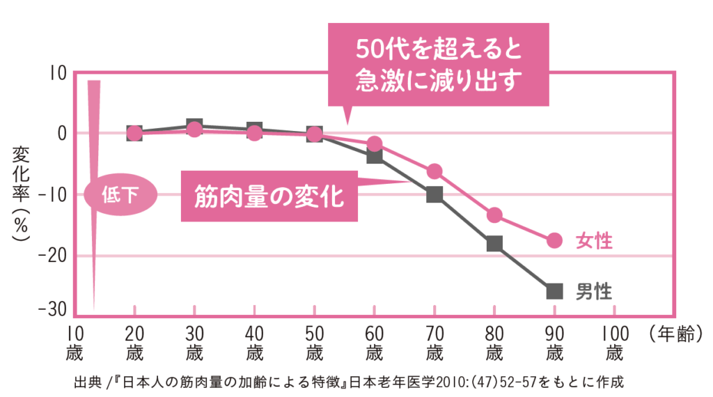 基礎代謝を上げる重要な要素である筋肉ですが、放っておくと体の筋肉量は減っていきます。その最も大きな理由が「加齢」です。