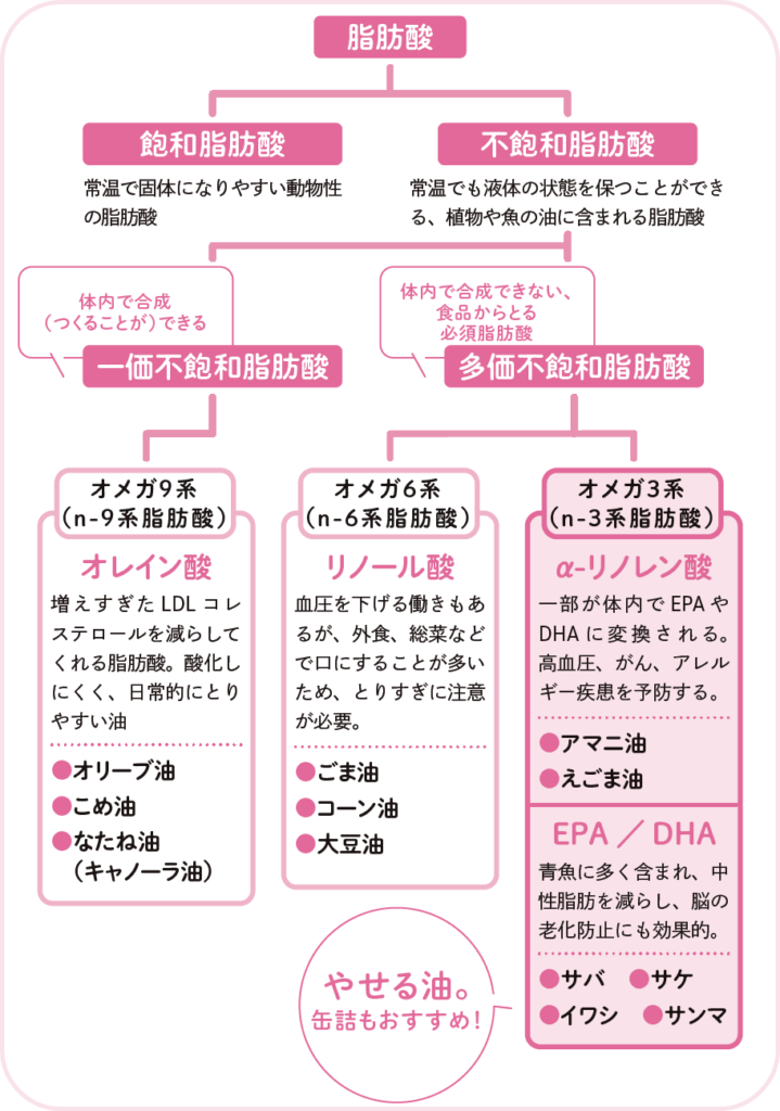 脂質の主成分である脂肪酸は、大きく2つに分けられます。1つは「飽和脂肪酸」といって肉の脂身やバターなど。エネルギー効率はいいけれども、とりすぎはコレステロール値を上げ、肥満につながります。