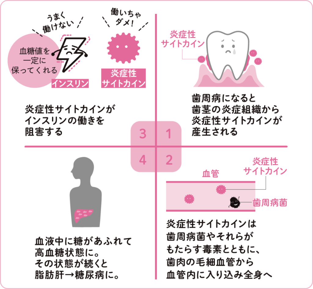 歯周病菌の影響でインスリンの働きを妨げ、血糖コントロールがうまくできなくなる。