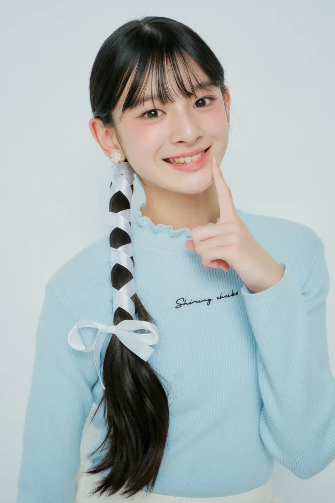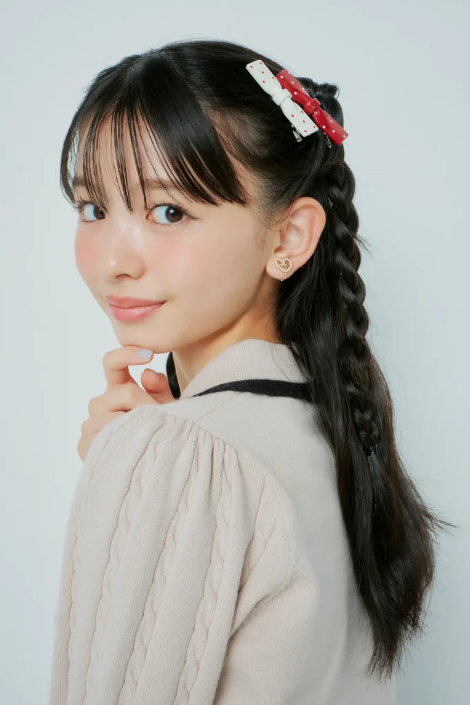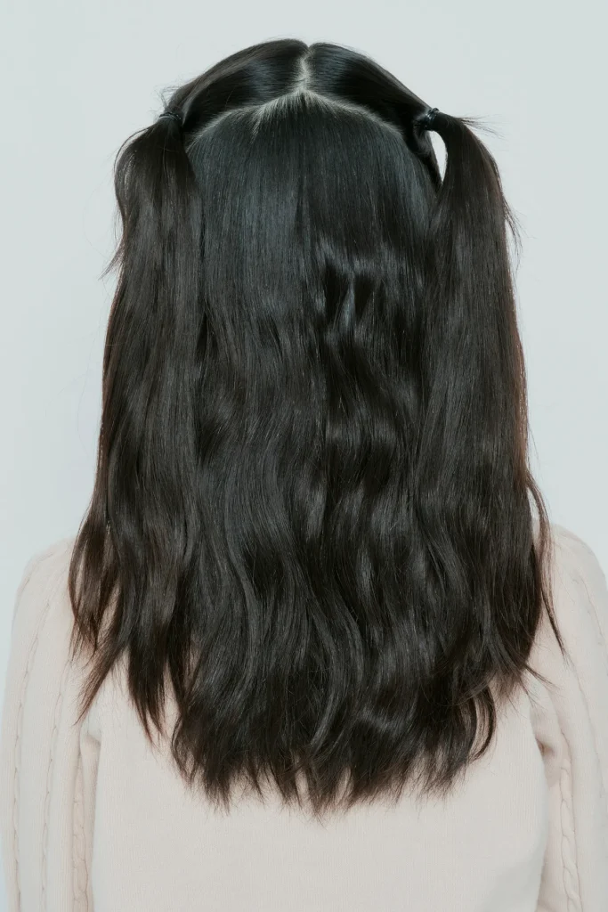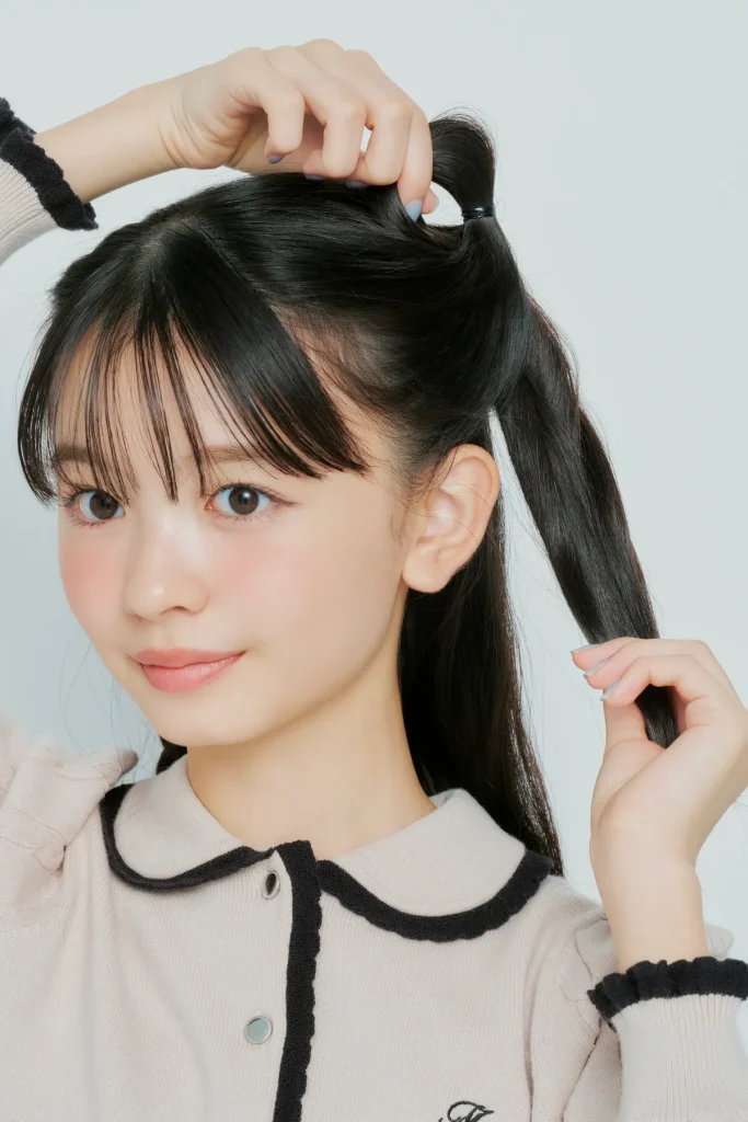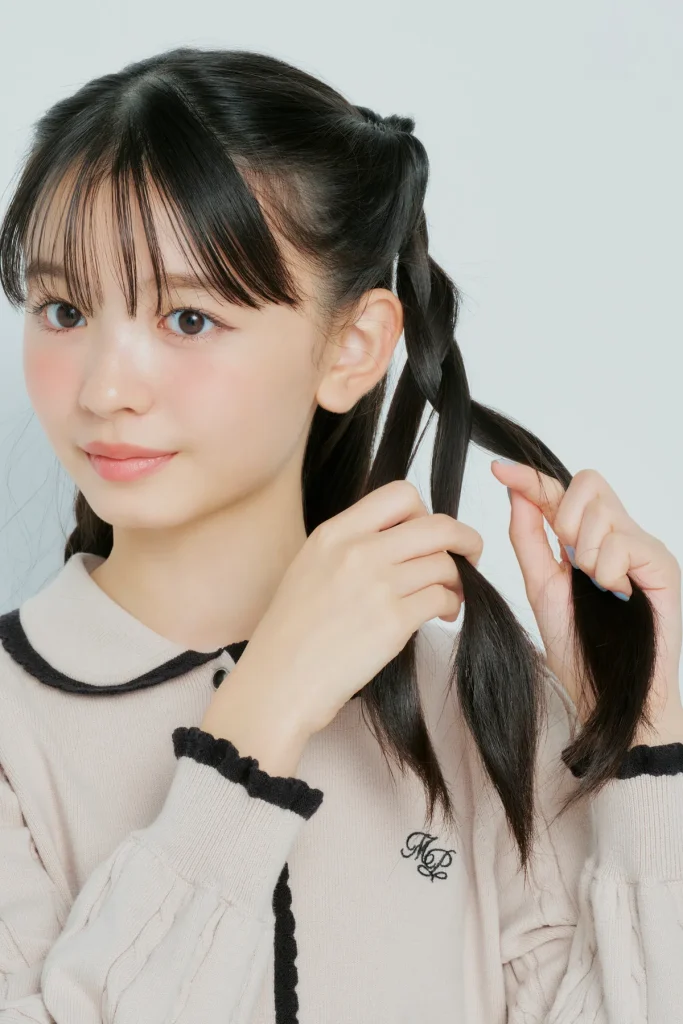 耳の後ろの髪を少し取ってゆるめのハーフツイン。位置は耳より少し上で、左右の高さが同じになるように結ぼう。