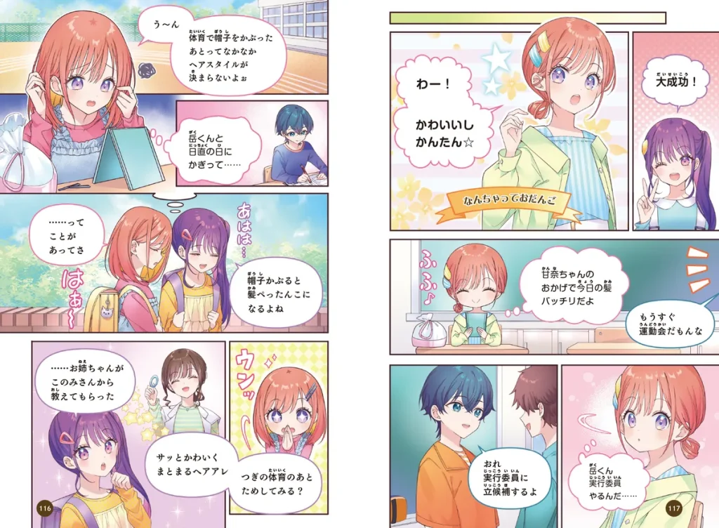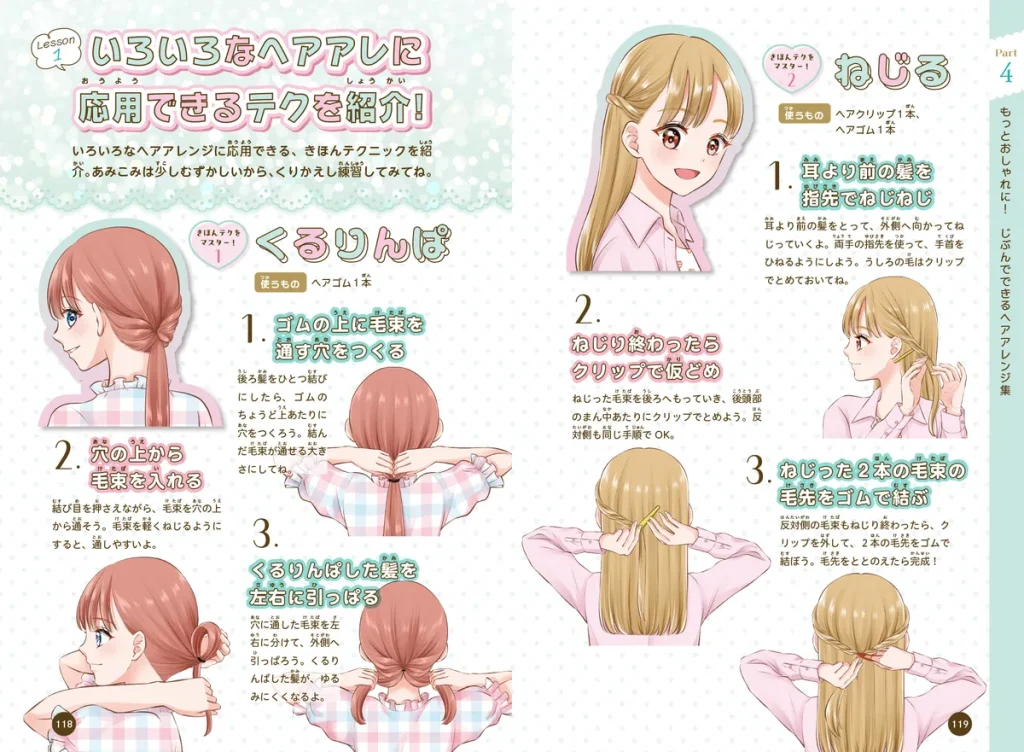 「くるりんぱ」「ねじる」のほかにも、「みつあみ」や「あみこみ」などを、とってもていねいにレクチャーしてくれるよ♪ 絵をみて学べるから、ヘアアレがみるみる上達しちゃう! たくさん練習して学校やおでかけのヘアアレンジにいかしてね☆を読んで、ファーストコスメをゲットしよう♪