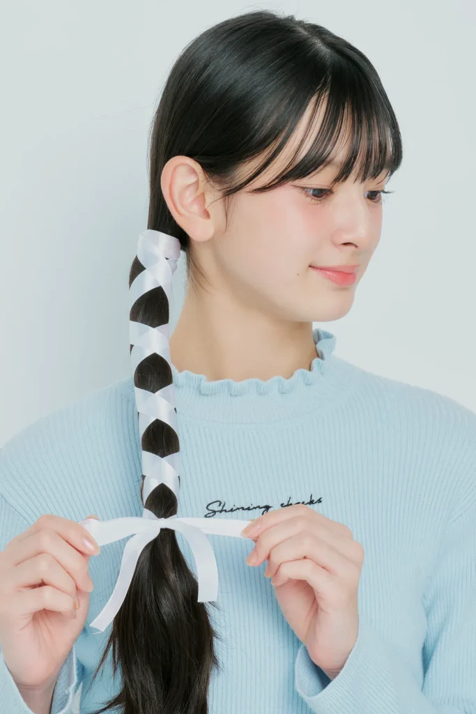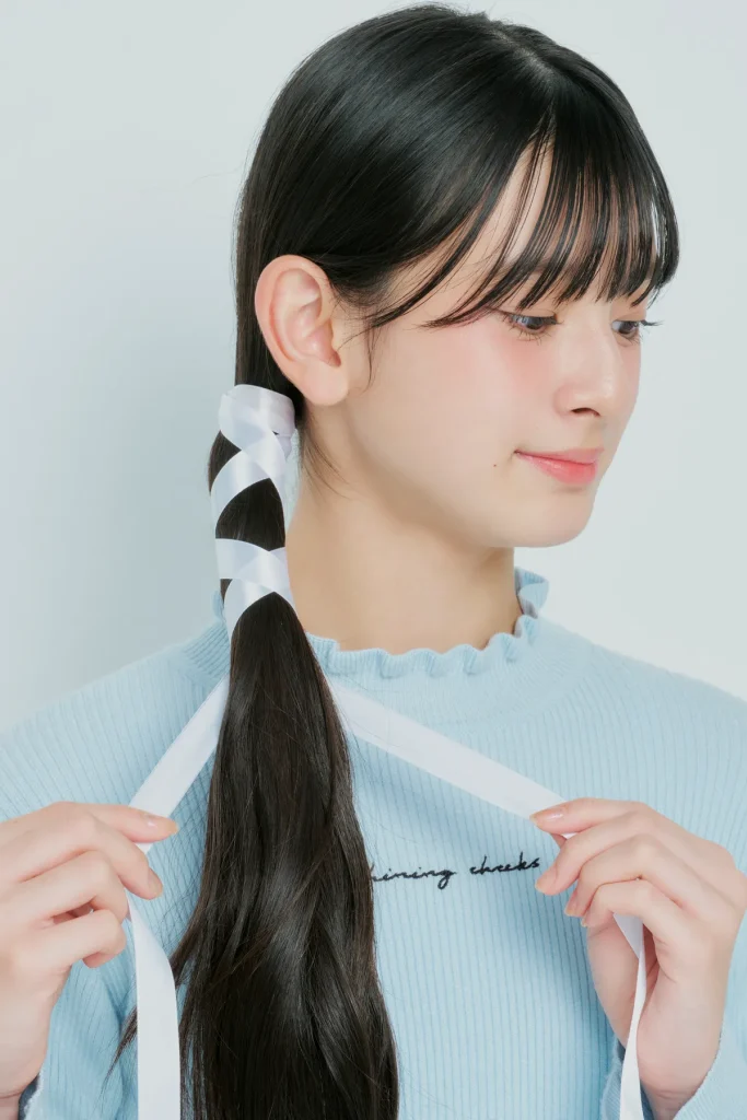 ポニテの根元から、リボンをクロスさせるようにまきつける。リボンでポニテの結び目はかくそう。