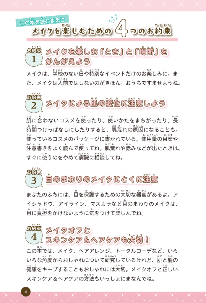 本書では、「メイクを楽しむための4つのお約束ごと」を提案しています。ぜひ親子で共有してください!