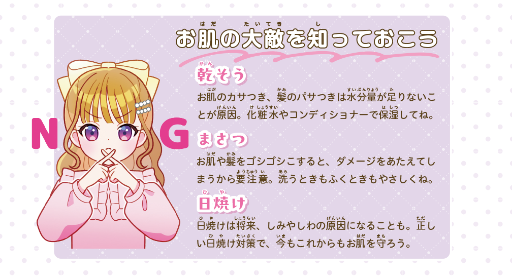 乾燥、摩擦、日焼けは年齢問わずNG。子どもには「どうしてダメなのか」をしっかり伝えたうえでケアの仕方を教えてあげて!