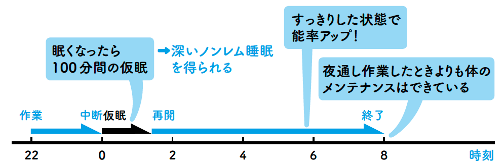 徹夜せざるを得ない場合は最初に眠気を感じたときに眠り、「黄金の90分」がすぎたころに訪れるレム睡眠のときに起きるとよいでしょう。100分前後と短い睡眠ですが、最初のノンレム睡眠を確保できているので、体の最低限必要なメンテナンスは整っているはずです。夜、眠くなったときに寝る。このあたり前のことが、じつは何より大切なのです。