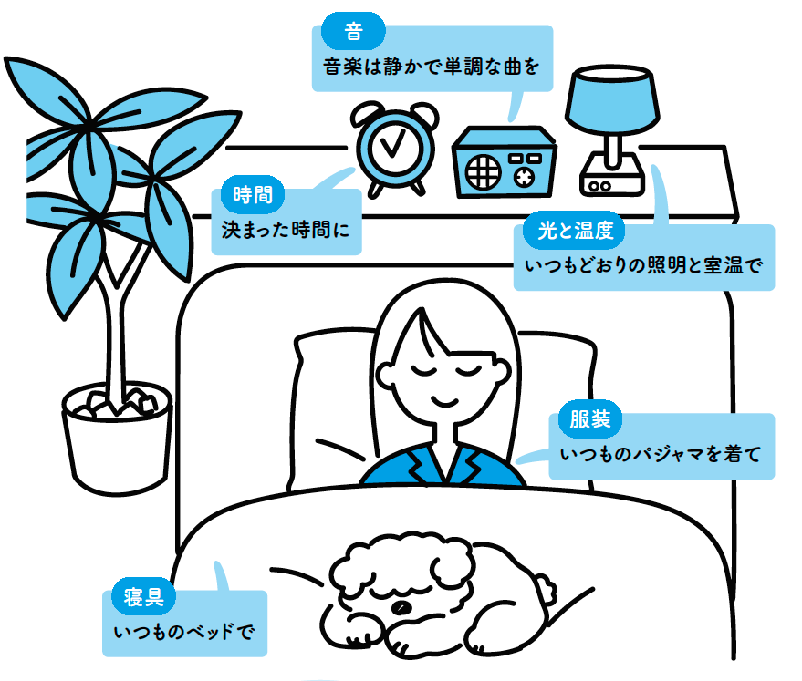 眠りにつくまでの決まりがあると、考えることが減るので眠りやすくなる! 睡眠に影響を与えやすい「時間」「寝具」「服装」「光」「温度」「音」などのルーティン(習慣)を決めておこう。