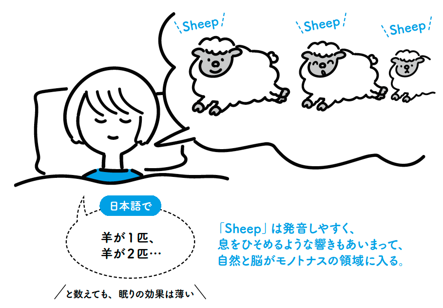 なかなか寝つけないときは、英語で「Sheep, Sheep, Sheep……」と数えてみる。脳を単調(モノトナス)な状態にすることができる。