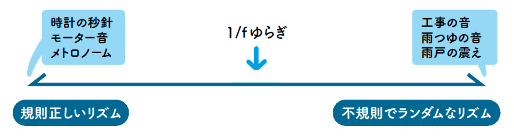 「1/fゆらぎ」は、予測できない不規則なゆらぎであり、「規則的な音」と「不規則でランダムな音」が調和した状態ともいえる。