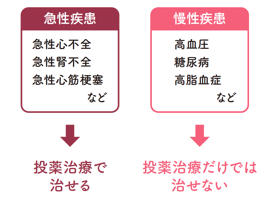 急性疾患を除いて、薬では慢性的な病気を根本的に治すことはできません。症状の緩和、原因となる菌を抑える、抵抗力の向上など、対症療法が薬の主な役割です。長期服用は副作用のリスクも高めます。