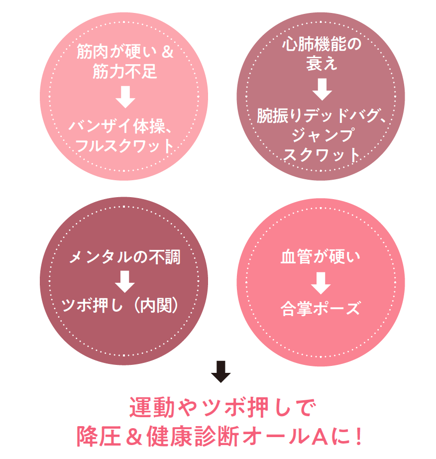 高血圧を招く4つの原因を根本から解消することで、下げた血圧をリバウンドさせず、やがて降圧薬を卒業できる体へと導いてくれる完全メニューです。さらに、この習慣が定着すると高血圧対策にとどまらず、健康診断の検査項目がオールAになるような「病気に強く、加齢に負けない、健やかな体」が自然とつくり上げられていくはずです。