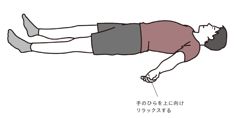 (1)仰向けに寝転び、足はまっすぐ伸ばして肩幅に開く。