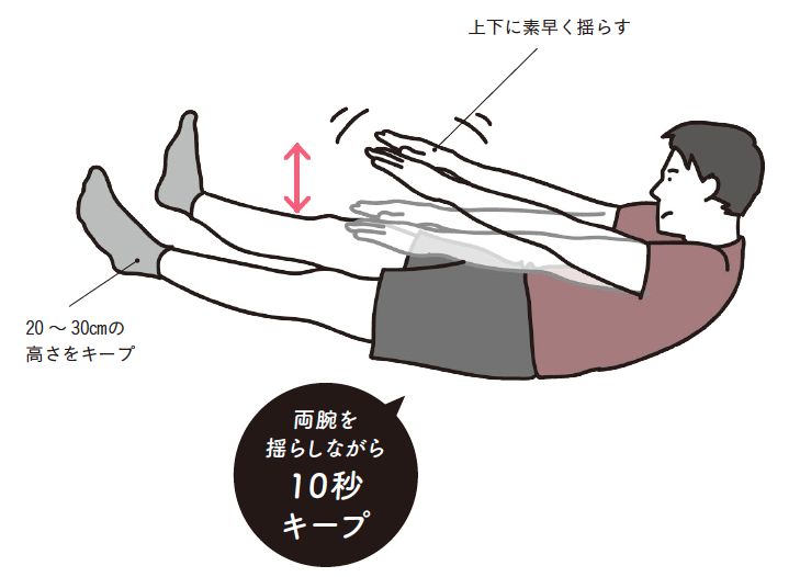 足を高く上げすぎると効果が低くなるので、床から20~30cm程度の高さをキープ。10秒2セットからスタートし、余裕が出てきたら15秒2セットにして負荷を上げましょう。