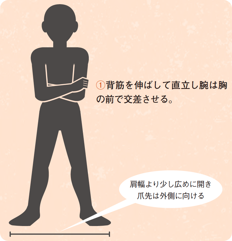 ①背筋を伸ばして直立し腕は胸の前で交差させる。