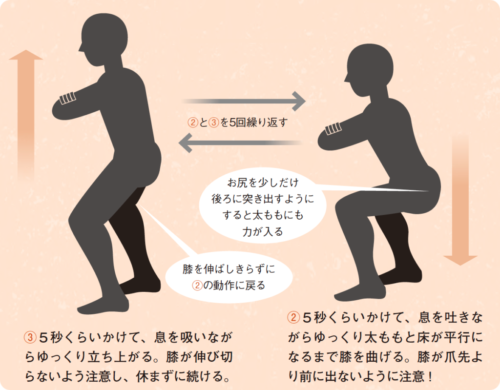 オススメは朝晩5回ずつのスロースクワットです。大腿四頭筋、ハムストリングス、大殿筋といった大きな筋肉を強く丈夫にする運動です。大きな筋肉を鍛えれば、エネルギー消費が増え、ブドウ糖を取り込む量も増えます。