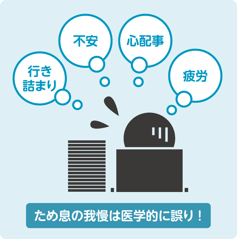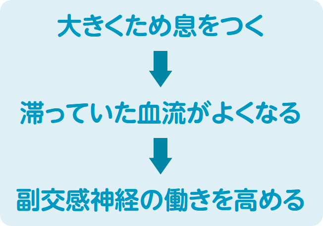 ため息が出るときは、心配事や悩み事を抱えていたり、根を詰めて作業をしていたりするときです。そのとき体は緊張でこわばり、呼吸が浅くなって血管が収縮し、自律神経が不安定になってしまいます。そこで「ふぅ~」とゆっくり長く息を吐くことで、浅くなった呼吸が深くなります。滞っていた血流をよくし、酸素の供給量も増え、副交感神経の働きを高めてくれます。つまりため息は、自分の心と体をリセットするすばらしい自浄作用なのです。反対に、ため息を我慢してしまうと、ますます血流が悪くなり、頭痛や肩こりなど肉体的な不調につながる可能性も高くなります。