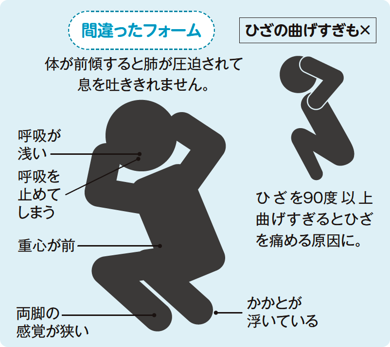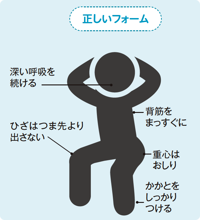 また、必ず正しいフォームで行うことも重要。間違ったフォームで続けていると十分な効果が得られず、足腰に負担がかかりケガや痛みの原因となる可能性も。最も気をつけたい点は、常に上半身をまっすぐに保つこと。体が前傾すると肺が圧迫され、深い呼吸ができなくなるからです。正しい姿勢を保ちつつ、腰を落とすときに口から息を吐き、上げるときに鼻から吸うように呼吸をするとより効果がアップします。