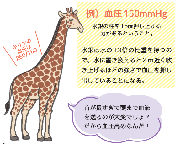 ちなみにキリンの血圧は上が260、下が160もあります。身長が5mある上に首も長く、心臓よりかなり高い位置に脳があるため、全身に血液を送るには人間よりも高い血圧が必要なのです。このことからも、体格によって血圧が違って当然だということがよくわかりますよね。