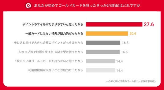 次に、18~29歳のゴールドカード保有者に対して「初めてゴールドカードを持ったきっかけ」について質問しました。その結果、「ポイントやマイルが貯まりやすいと思ったから」が27.6%、「一般カードにはない特典が魅力的だったから」が20.6%と、1位、2位にランクインしました。