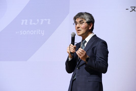 NTTソノリティ代表取締役社長の坂井は『当社は、 NTTの先進的な音響技術を用いて、ユーザーのインサイトに寄り添ったプロダクトやサービスの開発を2021年より行っています。音響ブランド「nwm(ヌーム)」は音を操る2つのコア技術を軸に、耳をふさがないイヤホンを開発。イヤホンなのに、まるでスピーカーのような開放感と臨場感のあるサウンドであることから「耳スピーカー」略して「耳スピ」という愛称で展開しています。