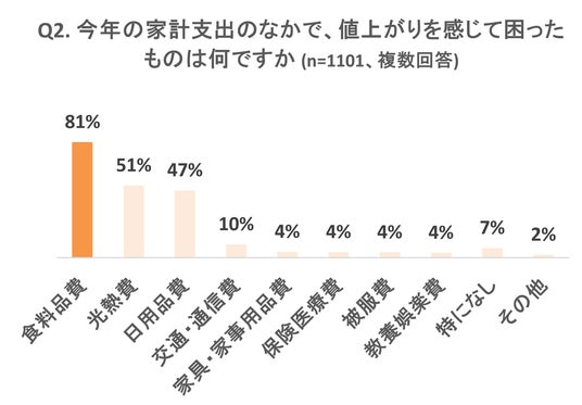 ●87%が1年前(2023年)と比較して今年は物価が上がったと回答(Q1)。値上がりを感じて困ったものは、81%が「食料品」と回答。その他、51%が「光熱費」、47%が「日用品費」と日々使うものに回答が集まった(Q2)。