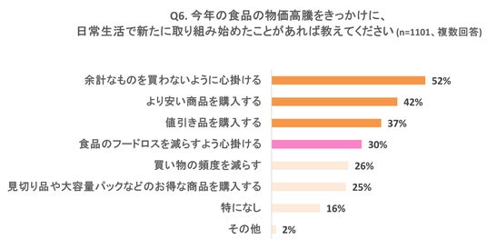 ●今年の食品の物価高騰をきっかけに日常生活で新たに取り組み始めたことを聞いたところ、「余計なものを買わないように心掛ける」(52%)、「より安い商品を購入する」(42%)、「値引き品を購入する」(37%)という支出を押さえる試みの他、「食品のフードロスを減らすよう心掛ける」(30%)という食材の無駄をなくす試みも上位にランクインした(Q6)。