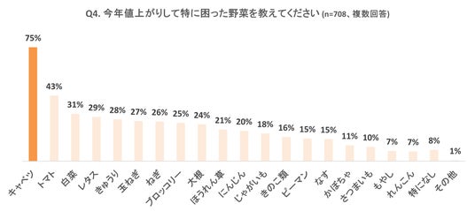 Q2で「食料品費の値上がりが困った」と回答した人に具体的な食品名を聞くと、79%が「野菜」、70%が「お米」と回答しました(Q3)。Q3で「野菜」と回答した人に、さらに具体的な品目を聞くと、75%が「キャベツの値上がりが特に困った」と回答。2位のトマト(43%)を引き離して圧倒的な回答が集まりました(Q4)。