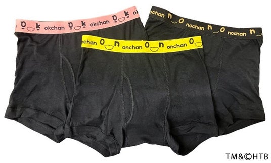 今回新たに生まれた商品は、「紳士アンダーウェア」より、「前開きボクサーブリーフ3枚セット」。ウエストのゴム部分のカラーがonちゃん・okちゃん・noちゃんに合わせて3種類(イエロー・ピンク・ブラック)あり、それぞれの目や口、ロゴがデザインされています。