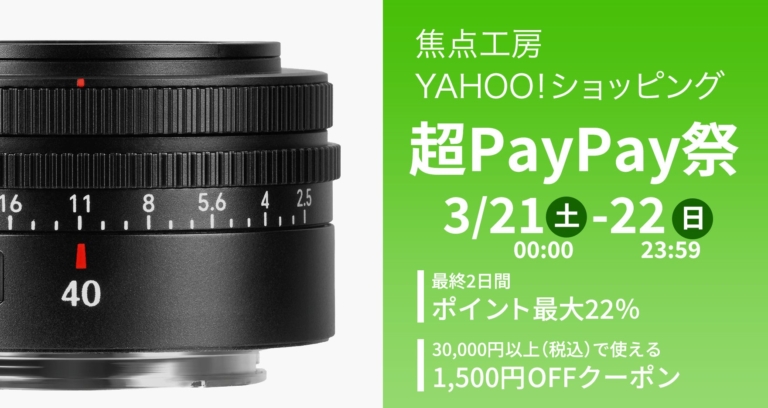 焦点工房Yahoo!ショッピング店は、「超PayPay祭」最終2日間に「ポイント最大22%還元」を実施します。また期間中は、「税込30,000円以上のご購入で使える1,500円OFFクーポン」などの特典をご用意。Yahoo!ショッピングにて、焦点工房の取り扱うレンズやマウントアダプター、アクセサリー…