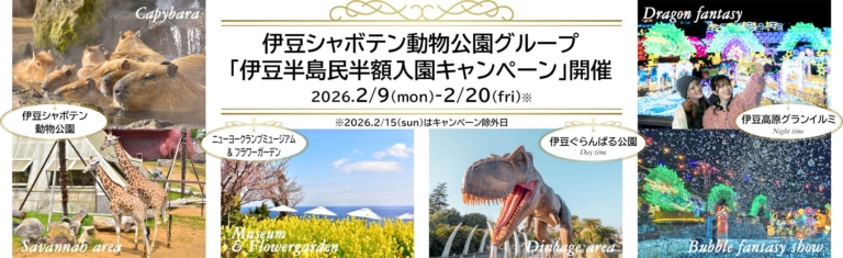 伊豆シャボテン動物公園グループでは、2026年2月9日(月)~2月20日(金)※まで、伊豆シャボテン動物公園、伊豆ぐらんぱる公園、伊豆高原グランイルミ及びニューヨークランプミュージアム&フラワーガーデンにおいて、日頃の地元地域の皆様のご愛顧に感謝して、伊豆半島民半額入園キャ…