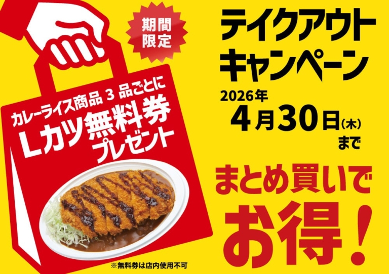 株式会社チャンピオンカレーカレー3品購入で「Lカツカレー無料券」をプレゼント 株式会社チャンピオンカレー(本社:石川県野々市市、代表取締役社長:南 恵太)は、テイクアウト利用の促進を目的としたキャンペーンとして、2026年3月23日(月)から4月30日(木)までの期間、テイクアウトでカレーメニューを3品ご注文いただいたお客様に次回のテイクアウトで使える「Lカツカレー無料券」を1枚プレゼントするキャンペーンを実施いたします。 本企画は、家族での夕食や職場でのランチなど、複数人で楽しむテイクアウト…