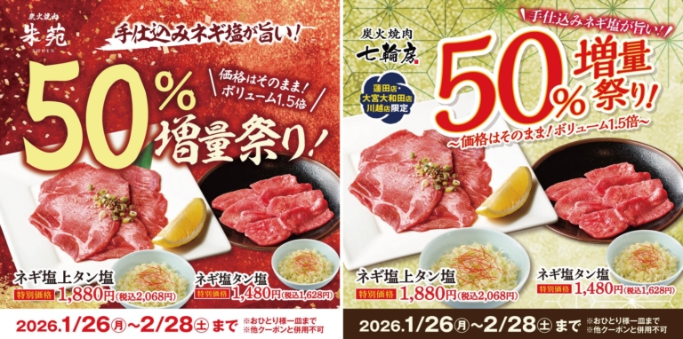 【50%増量】牛タン好き集まれ!「朱苑・七輪房」でネギ塩牛タンがボリューム1.5倍になる爆得フェア開催