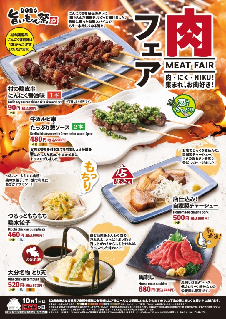 焼肉坂井ホールディングス~ 肉・にく・NIKU!集まれ、お肉好き! ~ 居酒屋「村さ来」八田店(名古屋市)、新大阪店(大阪市)では「村さ来 旨いもん祭 2026 」を、1月15日(木)から期間限定で開催いたします。今年の冬のテーマは「お肉の祭典」。葱(ねぎ)たっぷりの牛カルビ串に、にんにく香る秘伝のタレがやみつきになる鶏皮串。そして、お店でじっくり煮込んだ自家製チャーシューやおつまみに最適な馬刺しなど、暖かい店内で、ゆったり、お楽しみいただく6メニューをご用意いたしました。どうぞ、この機会にお…