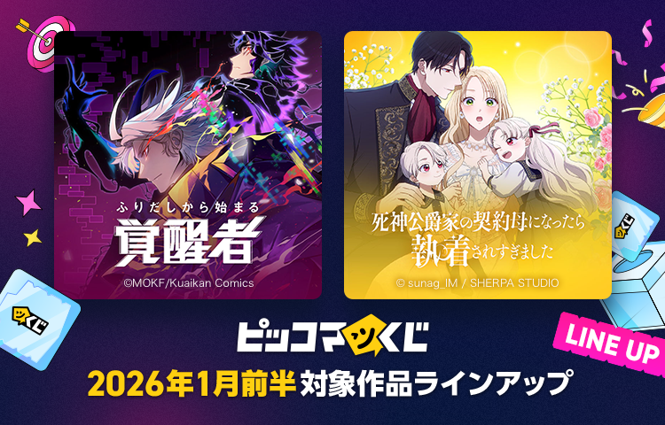 人気作品の限定グッズが当たる!『ピッコマくじ』1月前半ラインアップ公開「ふりだしから始まる覚醒者」「死神公爵家の契約母になったら執着されすぎました」が登場!