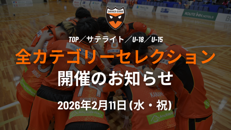 シュライカー大阪2月11日(水・祝)に開催されます、シュライカー大阪全カテゴリー(TOP・サテライト/U-18/U-15)セレクションの応募期間が延長になりましたのでお知らせいたします。 ■セレクション開催概要