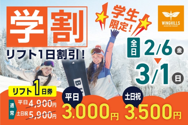 株式会社アルペンウイングヒルズ白鳥リゾート(岐阜県郡上市) スポーツ・アウトドア用品を販売する株式会社アルペン(本社:愛知県名古屋市、代表取締役社長:水野 敦之)は、岐阜県郡上市で天然温泉付きスキー場を運営するウイングヒルズ白鳥リゾートにて、2026年2月6日(金)より、学生向けの特別企画「学割リフト券」を開始いたします。
