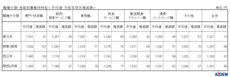 調査では、職種や募集時平均時給のデータを毎週抽出し、東日本エリア(東京、神奈川、埼玉、千葉など1都7県)と西日本エリア(大阪、兵庫、京都など2府5…