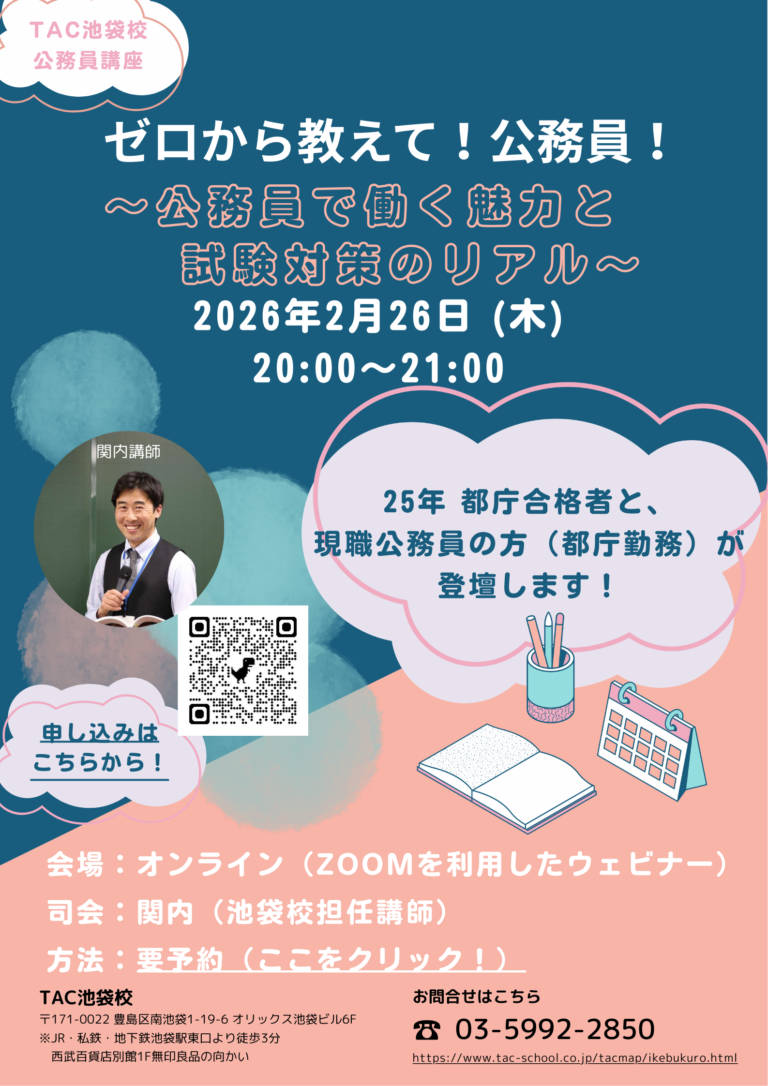 TAC株式会社TAC池袋校から配信します! 資格取得に向けた教育サービスを展開しているTAC株式会社(東京都千代田区、代表取締役社長:多田 敏男)では、公務員試験を検討されている方、学習中の方へ向けてナイトガイダンス「ゼロから教えて!公務員!~公務員で働く魅力と試験対策のリアル~」を、オンラインで開催します。
