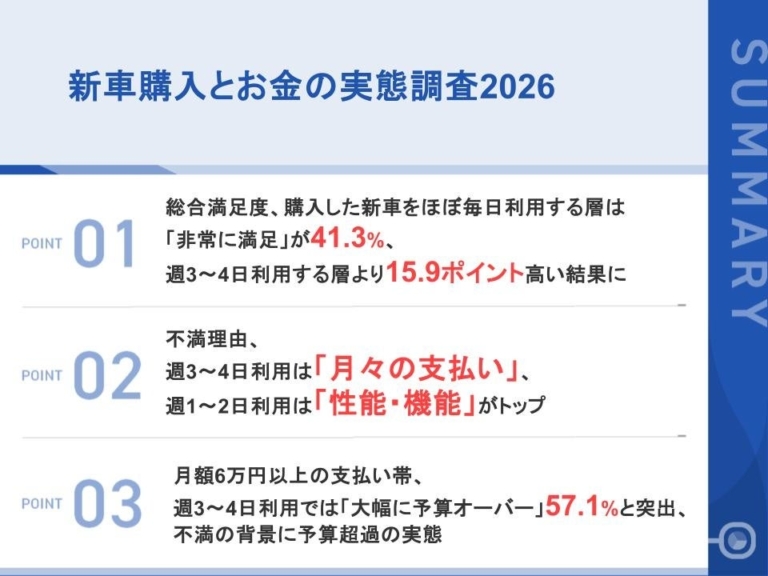 株式会社クルカ~使用頻度別に見る、満足度と不満理由のリアル~ 株式会社クルカは、直近3年以内(2022年1月以降)に新車を購入し、購入時の意思決定に関与した方 1,076名を対象に、新車購入とお金の実態調査2026を実施しましたので、お知らせいたします。本リリースでは、車のカテゴリ別に見た「満足は多いのに、不満の中心は支払いと維持費」を分析した結果をお知らせいたします。 – 01|総合満足度、購入した新車をほぼ毎日使用する層は「非常に満足」41.3%、週3~4日使用する層より15.9ポイント高…