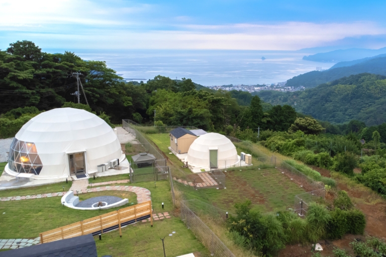 伊豆の山に囲まれたサイトでオーシャンビューグランピング