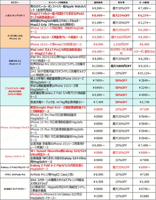 独創的なスマートフォン及びタブレット関連製品の開発・製造を行うShenzhen Lingyi Innovation Technology Co.,Ltdは、2024年11月27日(水)より12月6日(金)まで期間限定で「PITAKA 2024年ブラックフライデーセール」を開催します。最新のiPhone 16シリーズ用スマートフォンケースやiPad mini用のPITAKA MagEZ Folio 2のなどの周辺ガジェットなど対象製品をAmazon、楽天市場、自社公式日本語販売サイトにて最大50%オフの割引価格で販売いたします。さらに対象製品を購入する際にセット割引も実施いたします。