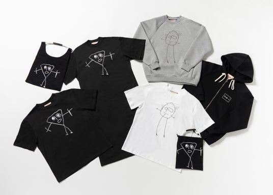 コレクションは、黒、ホワイト、グレーを基調としたシックで都会的なカラーパレットに、PiliとBiancaのユニークなプリントが映えるデザインが特徴です。このPiliとBiancaは、 カロリーナの娘・マルガリータがわずか5歳のときに描いたもの。お兄ちゃんのフィリッポとその友達ビアンカをモデルに、楽しそうに遊ぶ様子を描いたイラストには、子どもらしい純粋なクリエイティビティと遊び心がたっぷり詰まっています。母と娘が紡いだこの温かいストーリーが、Plan CのアイテムにHapinessをもたらし、ブランド全体を通じて愛と絆が表現されています。