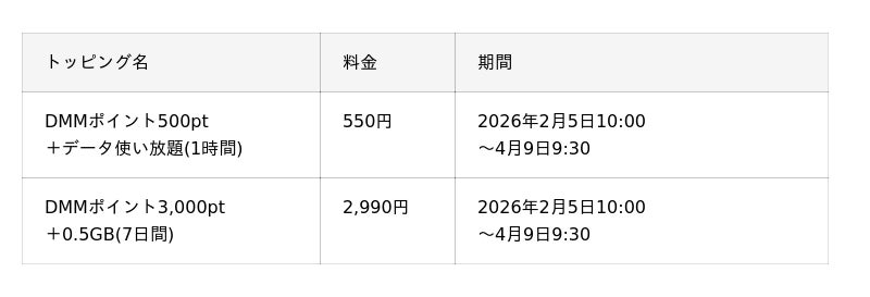 KDDI、沖縄セルラーは2026年2月5日から、povo2.0の「コラボトッピング」として、「DMMポイント500pt」と「データ使い放題(1時間)」(注1)がセットになったトッピングを550円、大容量の「DMMポイント3,000pt」と「0.5GB(7日間)」がセットになったトッピングを2,990円で提供します。