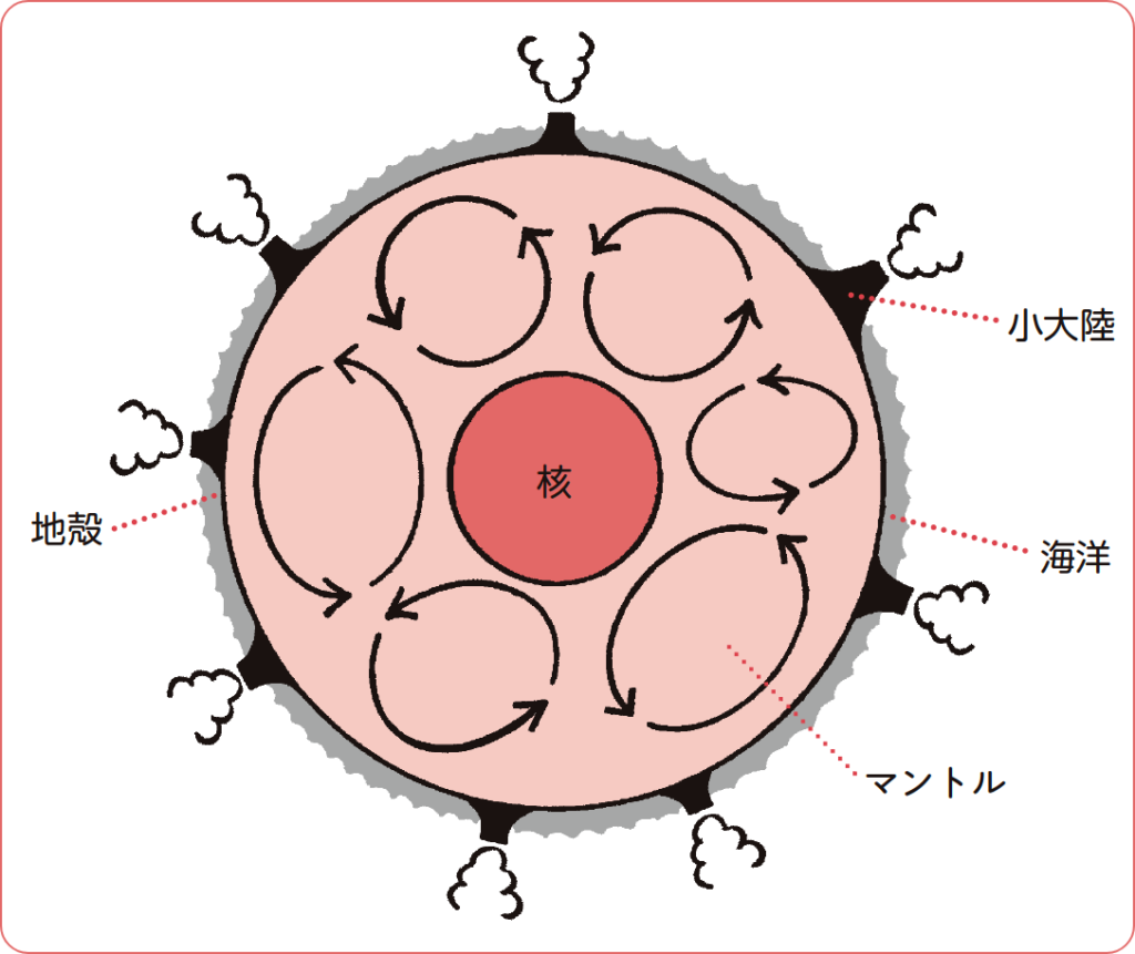 「マントル」は、「核」の熱によってお風呂のお湯のようにゆっくりと沸き上がり、沈み込むマントル対流をくり返していました。この過程で「熱水噴出孔」などによって生命のエネルギー源になる物質がつくり出されてきました。また、マントル対流によって陸地もだんだんと形成されてきました。